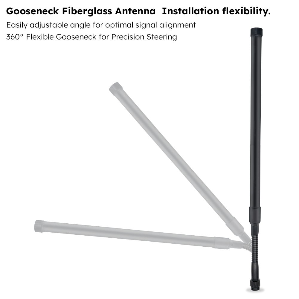 ABOOSTY ADCH001 4G LTE 698–960 / 1710–2690 MHz omni-directional gooseneck fiberglass whip antenna is designed for industrial IoT and M2M applications that require reliable outdoor cellular connectivity. The rugged Ø18 mm fiberglass radome and flexible gooseneck structure allow the antenna to be easily bent and oriented around metal cabinets, pipes and enclosures, ensuring stable 4G/3G/2G signal performance on site.