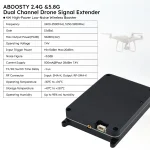 The ABOOSTY AEWN002 is a dual-channel 2.4G + 5.8GHz drone signal extender that enhances UAV communication links with dual 4W power amplifiers and ultra-low noise (<3dB). Compatible with IEEE 802.11a/n devices, the plug-and-play extender improves link quality and coverage by up to 80×. Each channel delivers 36dBm output, TX/RX gain of 15dB ±1, and fast switch time (<1µs). Designed for DJI drones, FPV drones, industrial UAVs, and military operations, it supports RF cable customization and heat dissipation with optional heatsinks or fans. LED indicators provide operational feedback. Operates in -30℃~+70℃ environments, storage up to 150℃, humidity up to 95%. Contact our engineering team for OEM/ODM projects or RF performance verification.