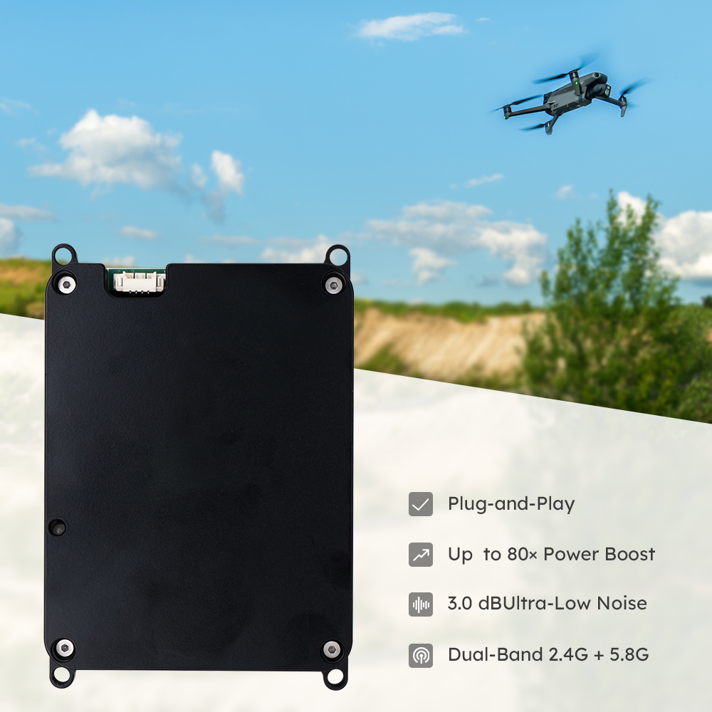 Dual-band 2.4GHz–2.5GHz & 5.15–5.85GHz drone signal extender with 4W amplifiers ,Ultra-low noise UAV signal booster for DJI & FPV drones , UGV and Industrial IOT
